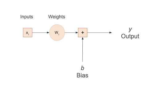 As described in Section 2, the first task we will assign to our artificial neuron is a regression problem. To simplify the representation, we can remove the activation function and keep only one input. Figure 3 shows what this simplification looks like.
