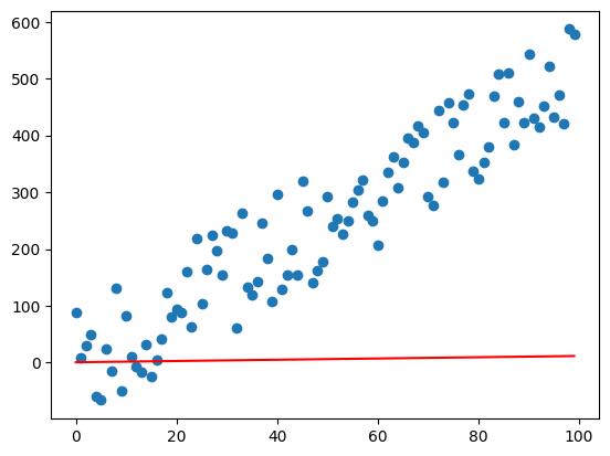 As you can see, the red line doesn't reflect the reality of the training data, which means we need to train the artificial neuron. The next step is to call the method train with epochs = 100000 and learning_rate = 0.00001. This will apply the backpropagation algorithm 100000 times and update the weight bias with a very low step, which helps the model converge to optimum values representing the data. The final values obtained after the training were: